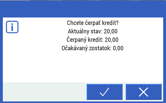 Automatické čerpanie kreditu - Pri nastavenom automatickom čerpaní sa systém pri načítaní karty stravníka na kase spýta na čerpanie kreditu a upozorní na výšku celkového kreditu a výšku čerpaného kreditu. Po potvrdení sa do účtu naťaží systémové kreditné PLU vo výške naťažených položiek.