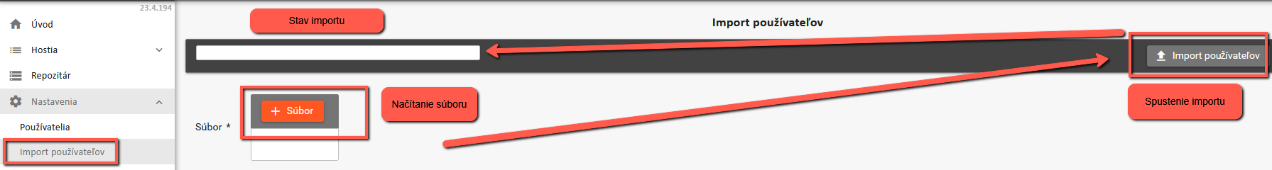 Pred začiatkom spustenia CWO je možné používateľov - stravníkov založiť hromadne, a to importom xlxs. Pri doplnení stravníkov je možné dopĺňať ich ručne alebo ďalším importom. Identifikátorom, či používateľ v systéme existuje, je login a e-mail. Login a e-mail musia byť rovnaké. Ak používateľ s daným loginom a e-mailom existuje, systém updatuje ostatné údaje používateľa. Štruktúra (stĺpce) súboru musí byť: Meno, Priezvisko, Login, E-mail, Telefon, Cislo Karty, Kod Profilu hosta, Cislo hosta. Názov stĺpcov sa nekontroluje, kontroluje sa poradie stĺpcov. Stĺpce Cislo Karty, Kod Profilu hosta, Cislo hosta hosťa nie sú povinné.