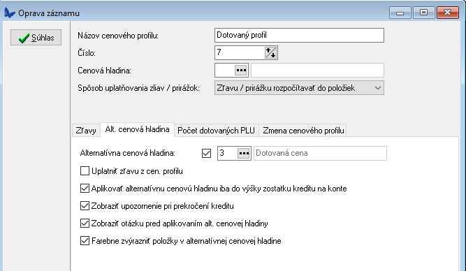 Upozornenie - pre aplikovanie alternatívnej cenovej hladiny platí, že množstvo položky nesmie prekročiť počet zadaný v tomto formulári. V opačnom prípade sa na takúto položku cenová hladina neuplatní.