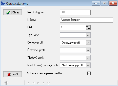 V menu Druhy kont je potrebné založiť konto typu Kreditná peňaženka. Musia byť zadefinované oba typy akcie: