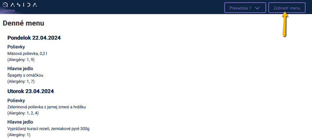 Denné menu je možné zobraziť po prihlásení sa na portál a potvrdení tlačidla Zobraziť menu. Menu sa zobrazí, ak je vyplnený jedálny lístok na konkrétne dátumy, resp. existuje aspoň jeden záznam v jedálnom lístku na konkrétny deň.