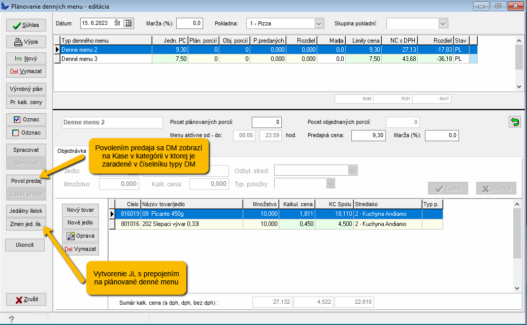 Jedálny lístok sa synchronizuje do CWO po jeho uložení tlačidlom Súhlas. V ponuke jedál je zobrazený v deň, na ktorý bol vytvorený (pole Dátum). Na KASE je denné menu zobrazené ak je potvrdená voľba Povoľ predaj. Predajná cena denného menu sa vypĺňa podľa zvoleného typu denného menu. Predajnú cenu možno editovať, ale táto zmenená cena sa neposiela do CWO.