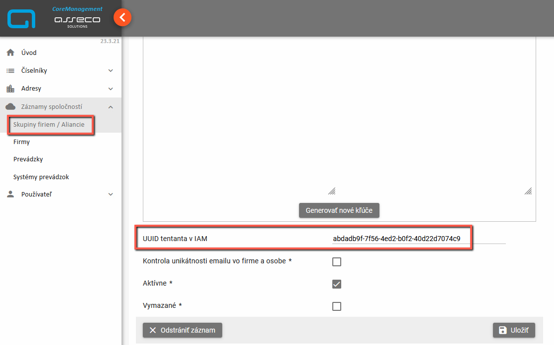 V aplikácii Titan v časti CoreManagement je potrebné doplniť UUID tenanta v IAM pre danú alianciu.
