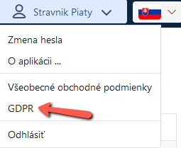 V prípade, že stravník chce odvolať svoj súhlas, môže tak urobiť po prihlásení sa do aplikácie, kde v menu vyberie GDPR. V spodnej časti potvrdí tlačidlo Odvolať súhlas. Po odvolaní súhlasu a znovu prihlásení do aplikácie sa podmienky opäť zobrazia na odsúhlasenie.