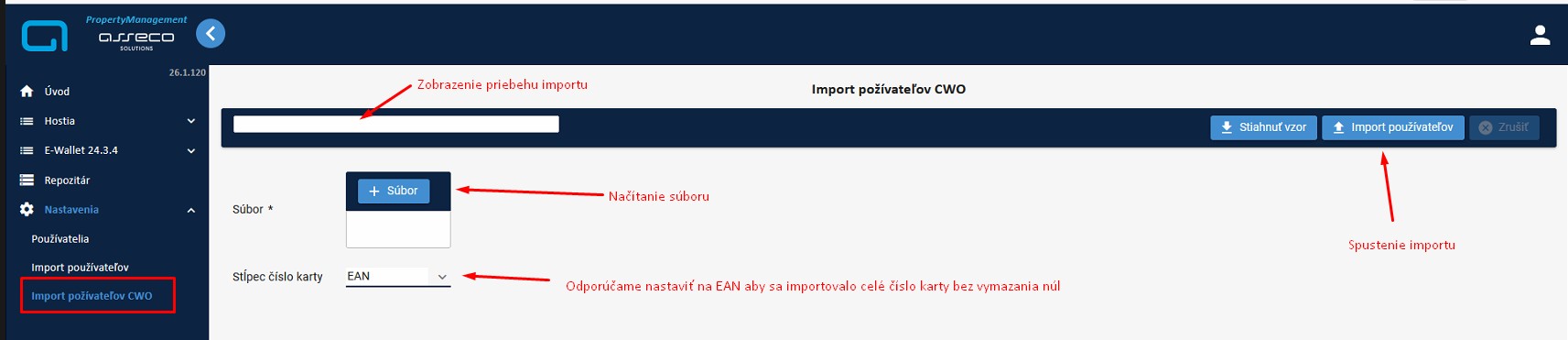 Samotný import sa vykoná v module PropertyManager - Nastavenia - Import používateľov ale Import používateľov CWO. V tejto časti je možné stiahnuť vzorový súbor importu.