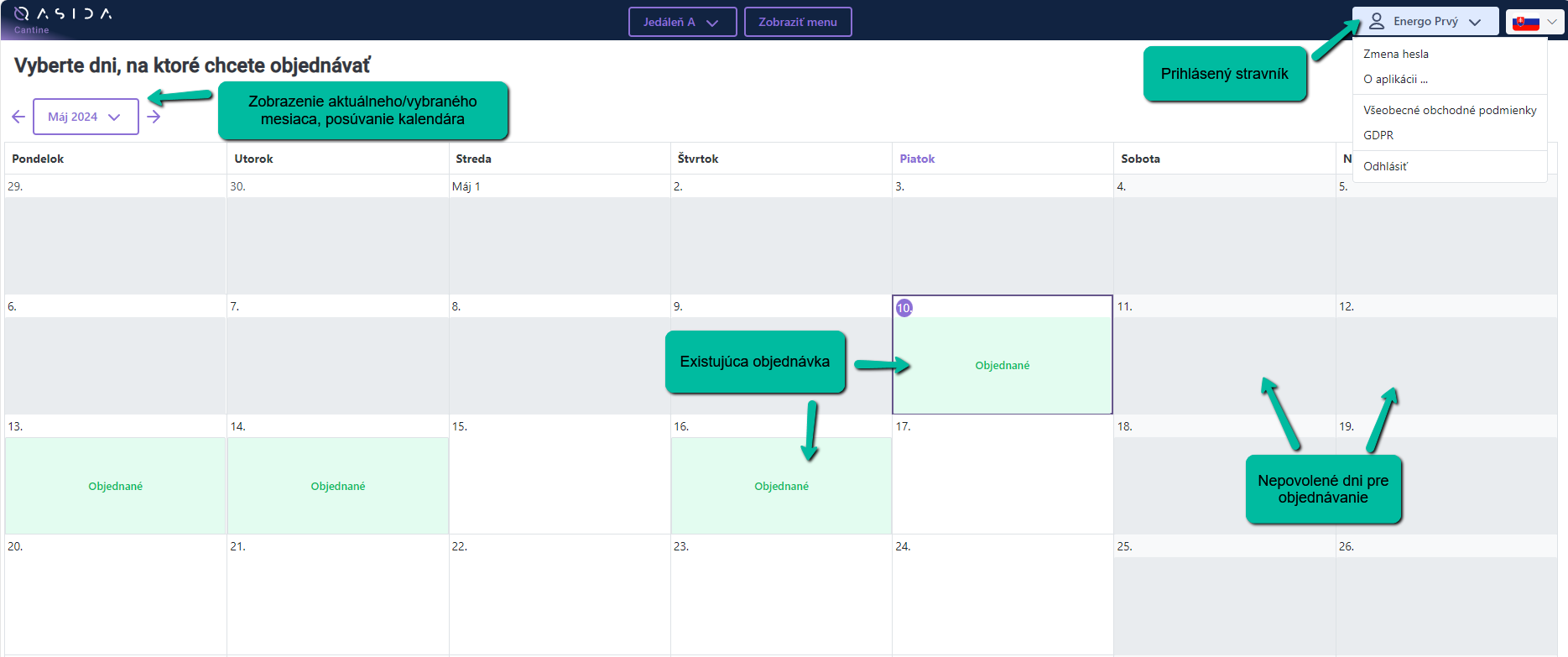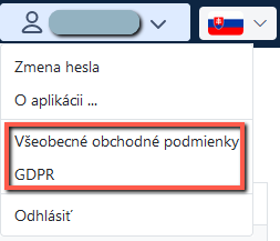 Všeobecné obchodné podmienky a GDPR sú zobrazené v hornom pravom rohu v časti o prihlásenom stravníkovi. Menu sa zobrazí pri potvrdení šípky pri mene.