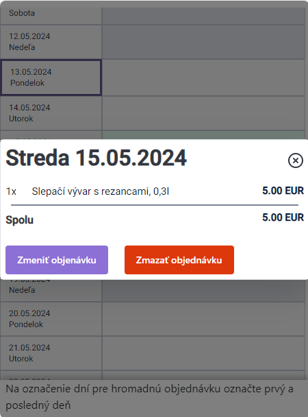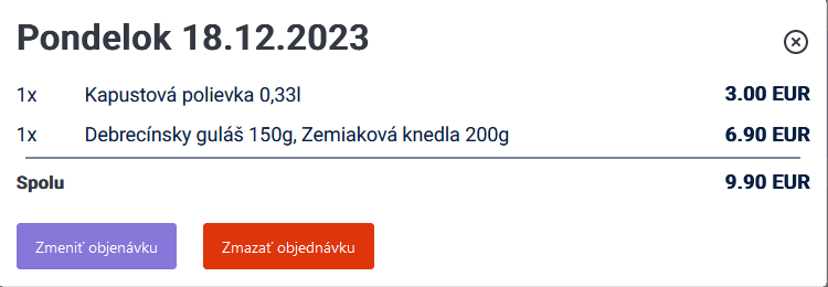 Objednávku stravy je možné upraviť. Stravník klikne na vybraný deň, zobrazí sa mu zoznam objednávky.