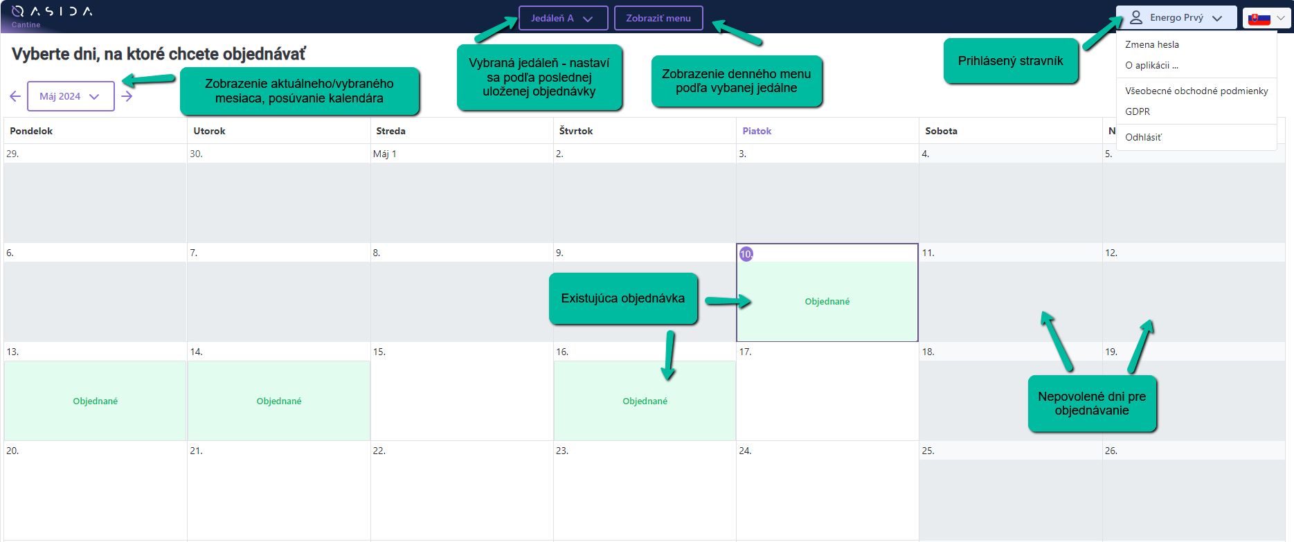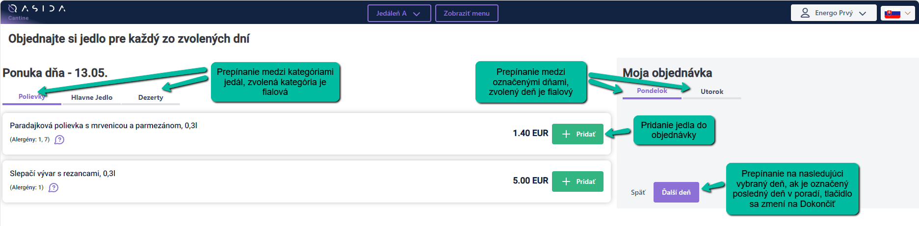 Stravník ako prví vyberie prevádzku - jedáleň. Posledná vybraná jedáleň zostáva zapamätaná pri ďalšom prihlásení stravníka. Stravník kurzorom označí deň a dvojklikom zvolený deň otvorí pre zadanie objednávky. Objednávku je možné urobiť aj na viac dní. Stravník potiahnutím kurzora označí viac dní pre vytvorenie objednávky. Po pustení kurzora sa otvorí detail objednávky, kde v časti Moja objednávka sú v záložkách zvolené dni. Označiť je možné iba dni nasledujúce za sebou. Označené dni sú šedé. Počet dní dopredu pre zadanie objednávky je nastavený prevádzkovateľom.