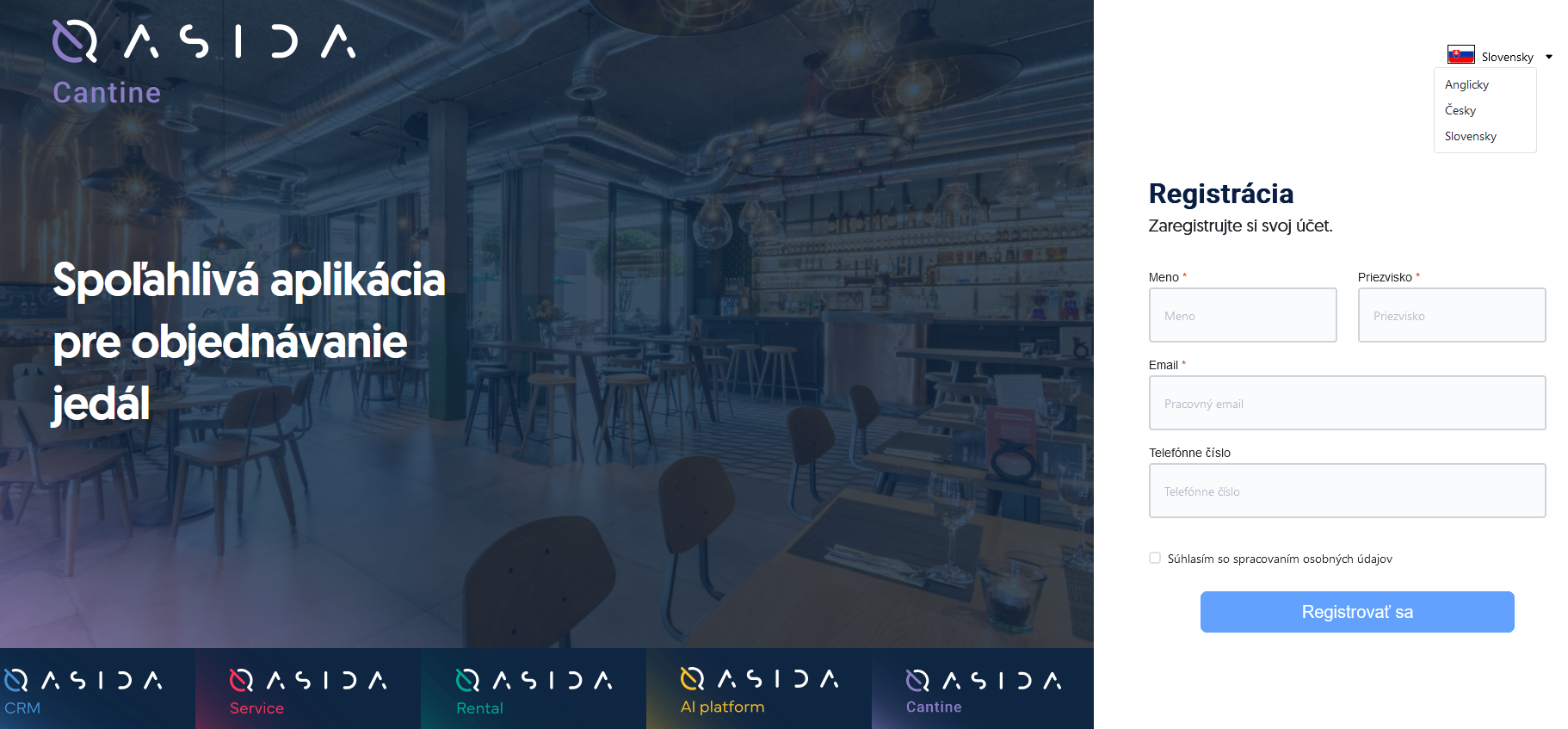 2. Stravník sa zaregistruje sám cez registračnú aplikáciu. Link na registračnú aplikáciu mu poskytne poskytovateľ stravy, ktorý ho obdrží od Asseco Solutions a.s. Po zaregistrovaní sa stravník obdrží e-mail s aktivačným linkom. Po potvrdení linku si zadefinuje heslo na prístup do aplikácie CWO. Prihlasovacie meno je e-mailová adresa stravníka. Jazyk aplikácie sa nastaví podľa prehliadača, v ktorom sa aplikácia otvorí, rovnako sa podľa prehliadača nastaví aj jazyk. Jazyk je možné meniť - podporovaná je okrem slovenčiny čeština a angličtina. Aktivačný e-mail a e-mail na zmenu hesla bude podľa zvoleného jazyka v registračnej aplikácii.