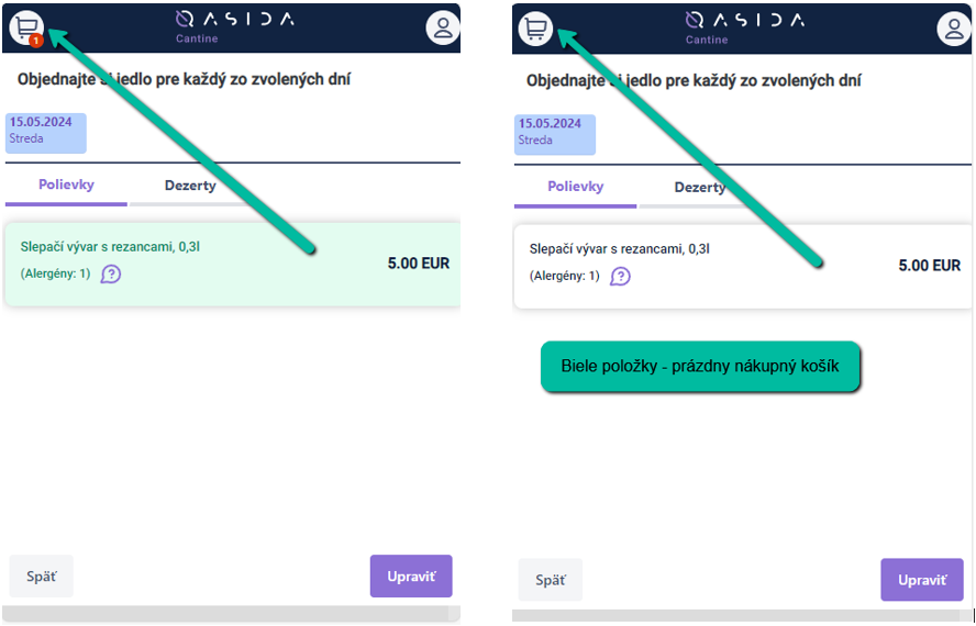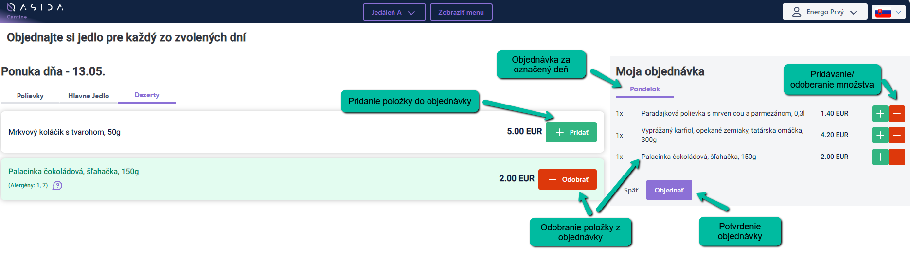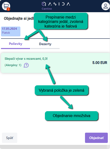 Stravník vybranú položku označí na zeleno a tlačidlom Objednať otvorí okno pre zadanie množstva. Počet objednaných jedál je zobrazený v nákupnom košíku.