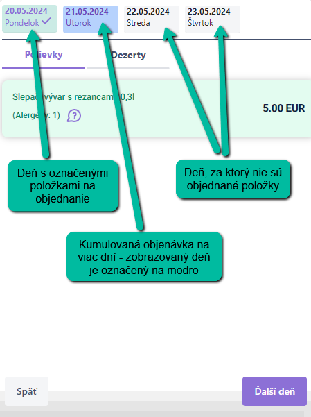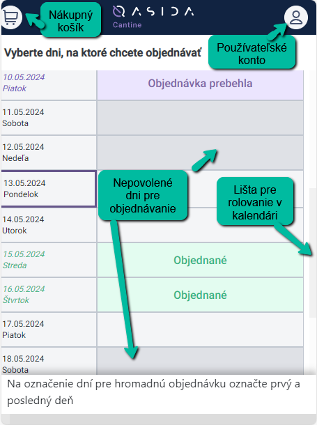 Stravník označí deň pre vytvorenie objednávky. Dvojklikom na vybraný deň otvorí detail objednávky. Objednávku je možné vytvoriť pre viac dní. Pri výbere viacerých dní stravník označí prvý a posledný deň. Pre uľahčenie je v mobilnej verzii zobrazená nápoveda pre objednávanie na viac dní. Označiť je možné dni idúce za sebou, tak že sa označí prvý a posledný deň. V kumulovanej objednávke je zobrazený deň označený na modro.
