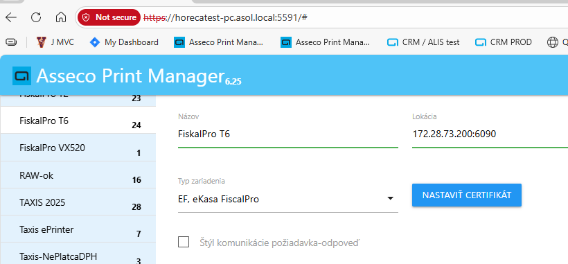 V APM je potrebné pridať ku každému zariadeniu eKasy, na ktorej má byť umožnená platba KVERKOM, jej aktuálny autentifikačný certifikát.