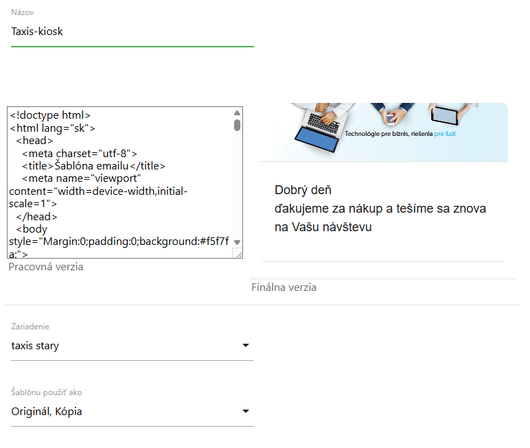 - Vzor sa zadáva do textového poľa v časti "Pracovná verzia". Vzor môže byť napísaný v HTML a takto importovaný do pola pre email.