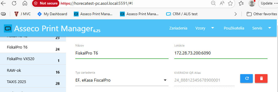 Po uložení je viditeĺná informácia o certifikáte - KVERKOM QR Alias a pod ním číslo.