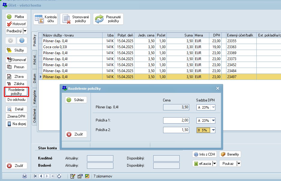 zadám si sumu a DPH pre obe položky, na ktoré sa vybraná položka zmení a kliknem na Súhlas - sumár nových položiek sa musí vždy rovnať pôvodnej položke.