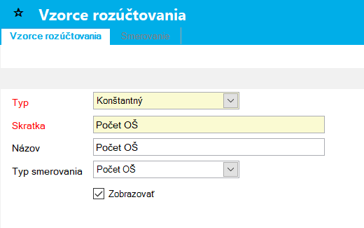 Príklad nastavenia pre konštantný vzorec na preúčtovanie sumy podľa počtu OŠ, ktoré budú zadané v záložke smerovanie.
