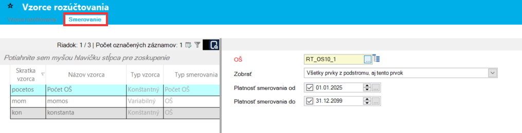 Pre takýto typ smerovania do záložky Smerovanie zadáte uzol OŠ. Pre tento typ vzorca je sprístupnená položka Zobrať a položka Konštanta je zrušená. Systém spočíta počet OŠ v tomto uzle, platné v čase spracovania rozúčtovania.