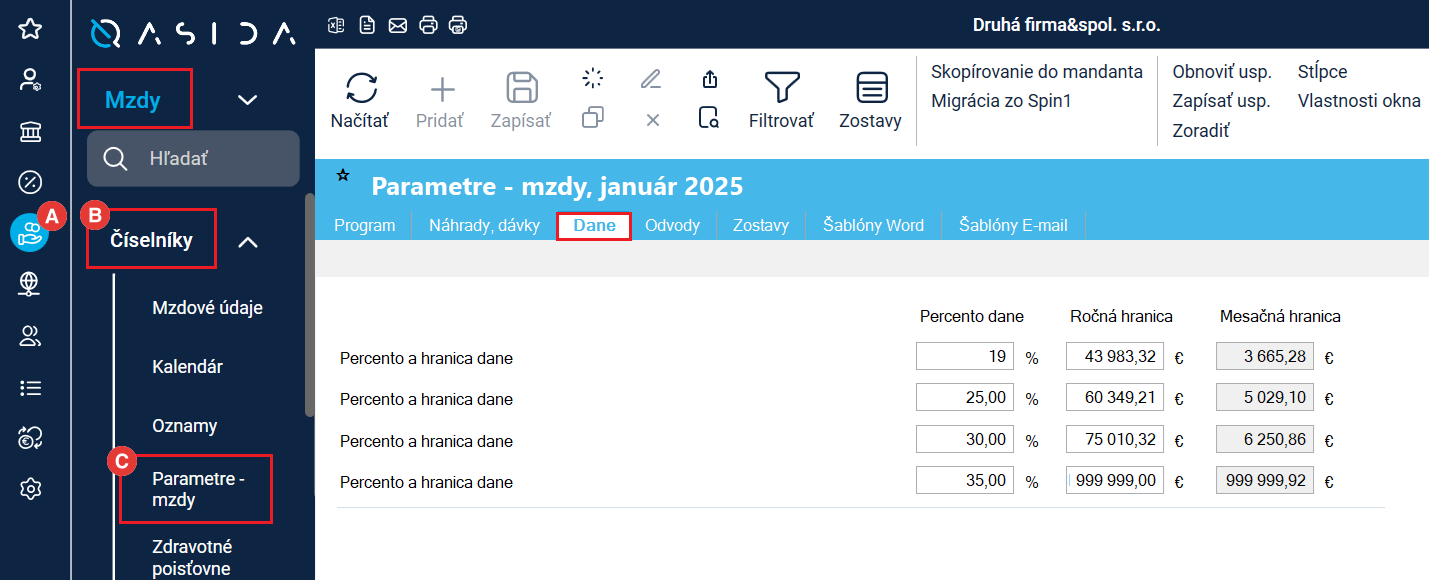 Mzdové legislatívne parametre a nastavenia modulu Mzdy, od ktorých sa odvíjajú výpočty miezd a odvodov, sú zoskupené v číselníku Parametre - mzdy. Číselník mzdových parametrov (C) je umiestnený v module Mzdy (A) v časti Číselníky (B). Je rozčlenený na jednotlivé záložky logicky zoskupujúce nastavenia pre danú oblasť.