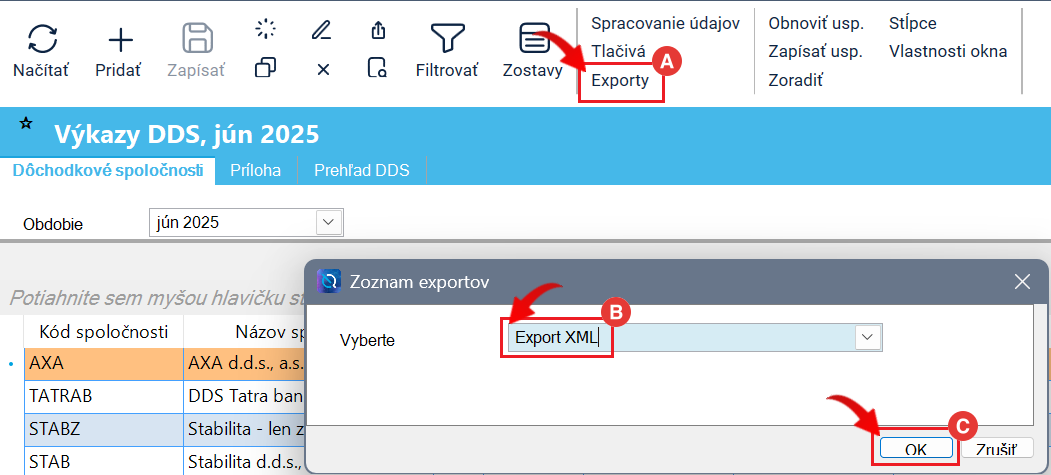 Akcia Exporty slúži na vytvorenie XML dávok s údajmi výkazu. Ak v zozname dôchodkových spoločností označíte jeden riadok, vytvorí sa jeden súbor pre vybranú dôchodkovú spoločnosť. Ak označíte viac alebo všetky riadky (Ctrl+A), vytvoria sa súbory pre vybrané alebo všetky dôchodkové spoločnosti. Názov XML súboru je v štruktúre DDP_RRRR-MM_Kód-DSS (napríklad DSS_2025-06_STABZ.XML), kde kód je prevzatý z definície v číselníku Dôchodkové spoločnosti. Program pri generovaní súborov otvára okno, kde je možné vybrať adresár, kam chcete súbor uložiť. Predvolený adresár je možné zadať v module Program > Nastavenia > Mzdy > Zostavy > pole Cesta k exportovaným súborom pre DDP. Po exporte údajov program zobrazí oznam: “Export súborov prebehol úspešne.”
