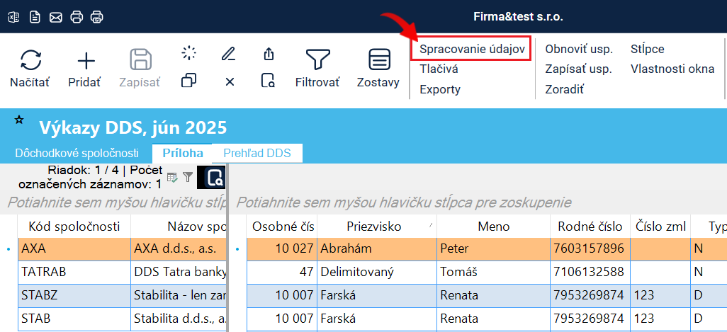 Okno Výkazy DDS je rozdelené na tri záložky - Dôchodkové spoločnosti, Príloha a Prehľad DDS.