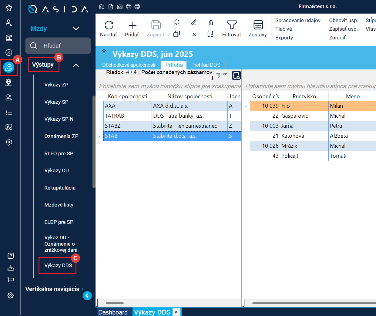 Mesačné výkazy dôchodkového sporenia sú umiestnené v module Mzdy (A) v časti Výstupy (B) pod názvom Výkazy DDS (C).