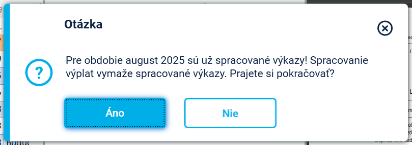 Spustením akcie Spracovanie výplat sa menia vypočítané údaje v spracovaných výplatách, čo má dopad na údaje vo výkazoch. Preto je potrebné všetky výkazy za spracovávané obdobie vymazať. Ak už výkazy pri spustení Spracovania výplat existujú, program zobrazí oznam “Pre obdobie (…) sú už spracované výkazy! Spracovanie výplat vymaže spracované výkazy. Prajete si pokračovať?”