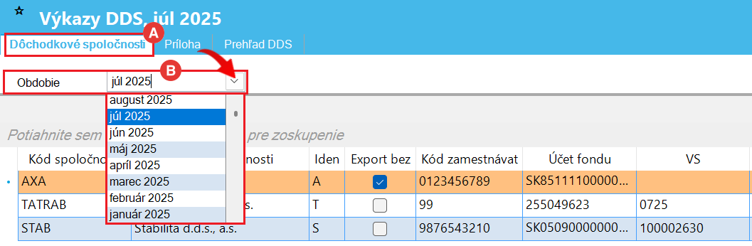 V ERP Qasida nie je potrebné pre spracovanie výkazov vykonávať Zmenu mzdového obdobia. Každý mesačný výkaz môžete spracovať v aktuálnom (otvorenom) období za ktorýkoľvek z minulých mesiacov. Požadovaný mesiac si vyberte v poli Obdobie (B) umiestnenom v záhlaví okna Výkazy DDS na záložke Dôchodkové spoločnosti (A). Ak vo vybranom mesiaci nie sú spracované výkazy, program automaticky opýta, či ich chcete vygenerovať.