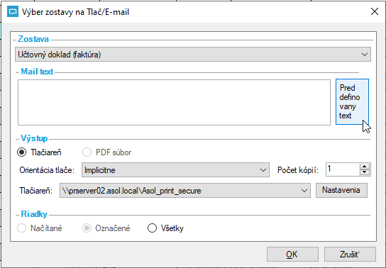Po spustení akcie Hromadná distribúcia faktúr sa zobrazí dialógové okno, kde si používateľ vyberie zostavu, tlačiareň (predplnená bude posledná použitá) a text e-mailu (možnosť vybrať z predvolených textov).